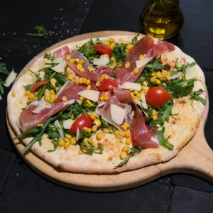 Blat pizza - 200g (făină albă (conține gluten) - 121.21g, apă - 71.97ml, sare, ulei de măsline, drojdie), roșii cherry - 100g, prosciutto crudo - 60g, porumb - 60g, rucola - 40g. Informații nutriționale 100g Valoare Energetică (kJ/kcal): 721.2 / 172, Grăsimi (g): 27.6 din care: Acizi grași saturați (g): 4.4, Glucide (g): 3.3 din care: Zaharuri (g): 1.5, Proteine (g): 4, Sare (g): 0.9. Alergeni: gluten